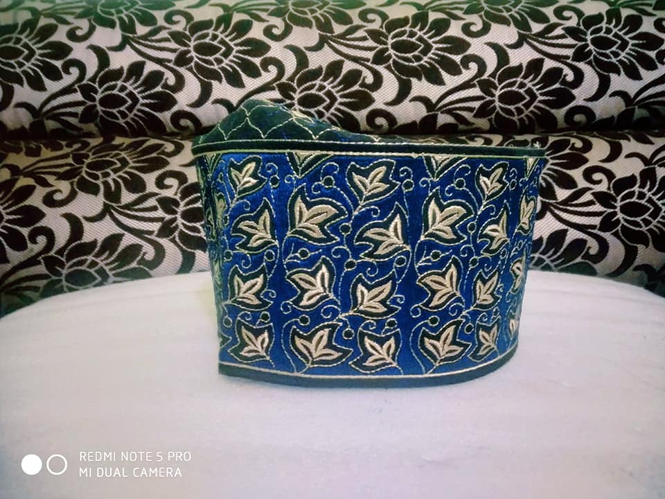 Inch tape se sar ko Golai me naap lijiye ya tailor ko kahiye wo naap likh ke de degaBanarasi Barkati Topi Blue Golden Leaf Design this type of topi we made these cap with our best machine of embroidery find suitable designs and catalogs jazak Allahplz share this cap so others can buy easily.