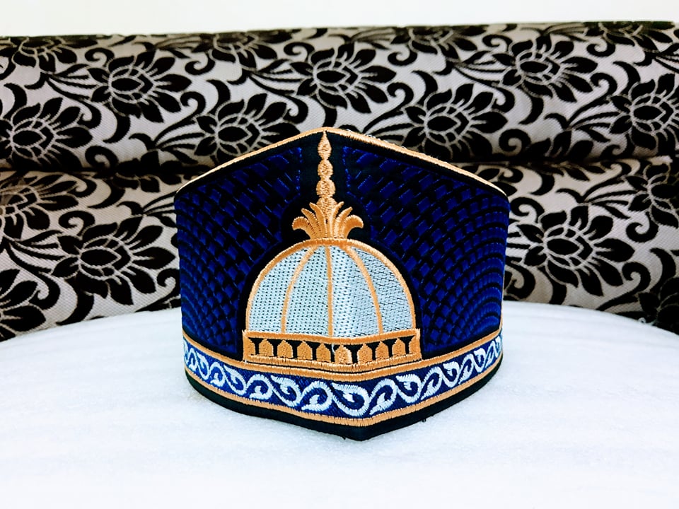 Barkati Golden Blue Garib Nawaz Gumbad Topi this type of topi we made these cap with our best machine of embroidery find suitable designs and catalogs jazak Allah plzz share this cap so others can buy easily.